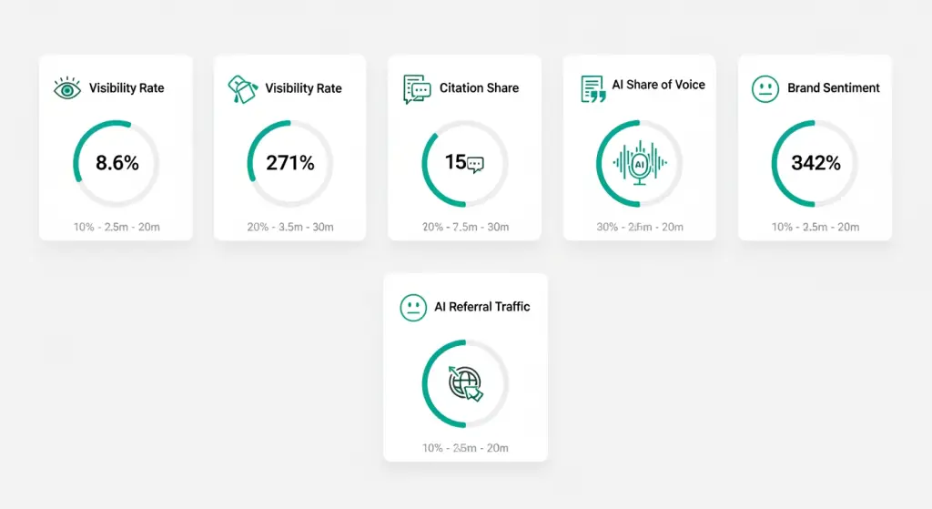 Zu den wichtigsten KPIs für die KI-Suchsichtbarkeit gehören: Sichtbarkeitsrate (wie viel Prozent der getrackten Suchanfragen deine Marke enthalten), Citation Share (wie viel Prozent der Erwähnungen einen klickbaren Link zu deiner Domain enthalten), AI Share of Voice (Erwähnungen deiner Marke im Vergleich zu Wettbewerbern in einem Themencluster), Brand Sentiment (wie AI-Systeme deine Marke beschreiben) und AI Referral Traffic (Sitzungen und Konversionen von AI-Oberflächen, die in GA4 getrackt werden). Diese Metriken ersetzen die Einfachheit der traditionellen Keyword-Rankings.