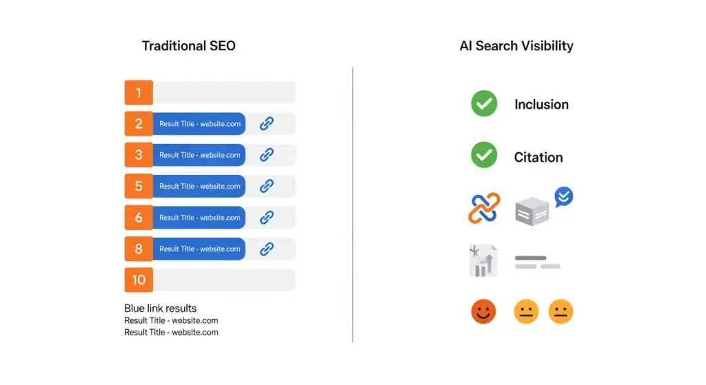 Das ist der springende Punkt: Das ist ein grundlegender Unterschied zur klassischen SEO. Bei der traditionellen Suche misst du den Rang pro Keyword. Position 1, Position 5, Position 23. Sauber, vergleichbar, nachvollziehbar. Bei der KI-Suche lautet die Frage nicht: „Wo stehe ich?“ Sie lautet: