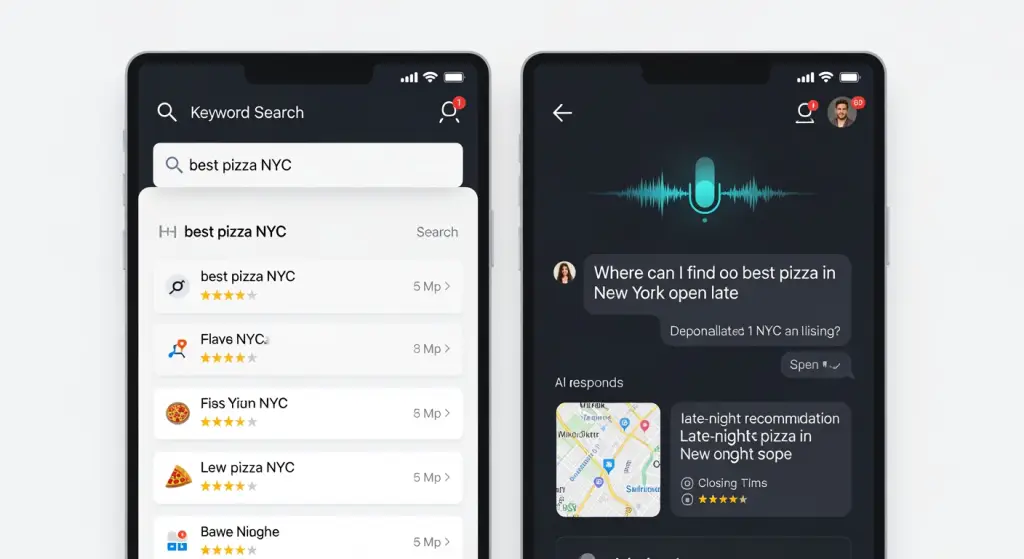 Split-Screen-Vergleich zwischen traditioneller Stichwortsuche und konversationeller Sprachsuche mit KI-generierter Antwort