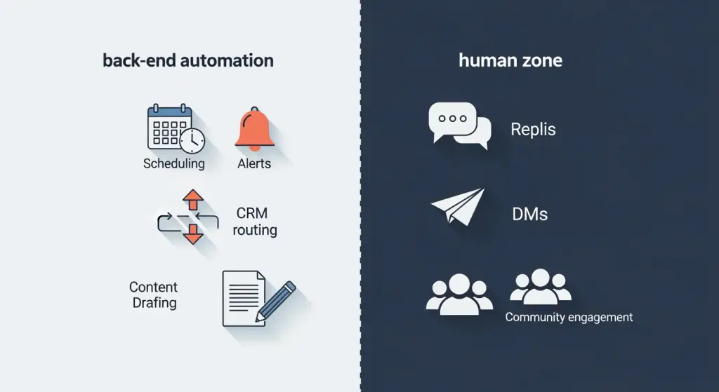 Der Rahmen, auf den ich immer wieder zurückkomme – ich nenne ihn seit ein paar Jahren selektive Automatisierung – zieht im Grunde eine harte Grenze zwischen Back-End-Logistik und Front-End-Konversationen. Automatisiere Ersteres. Schütze Letzteres. In der Theorie einfach, in der Praxis ein echter Fortschritt.
