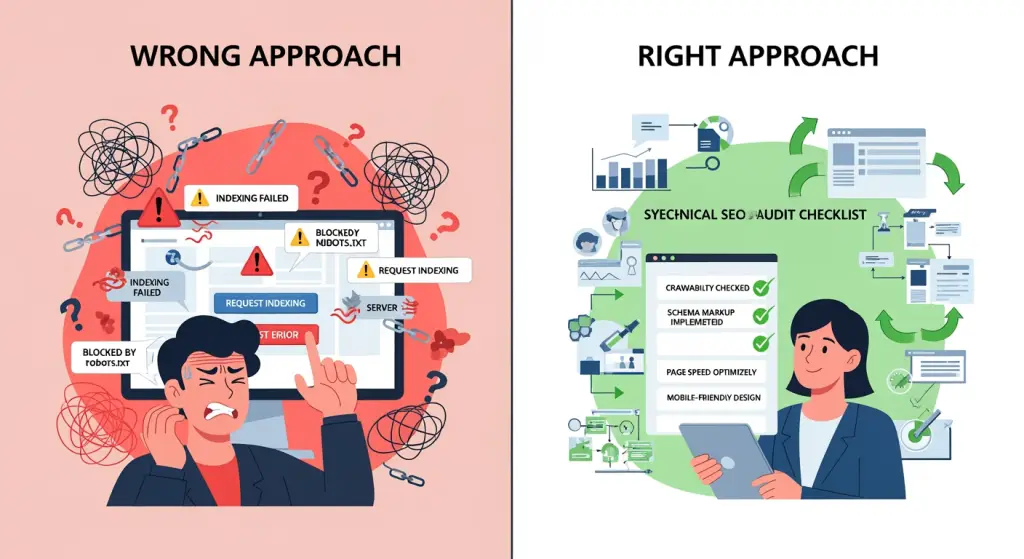 A maioria dos gerentes de SEO comete os mesmos erros ao tentar corrigir esse problema. Eles se concentram nos sintomas, não na causa. Deixe-me poupá-lo de meses de frustração explicando por que as abordagens usuais são insuficientes.