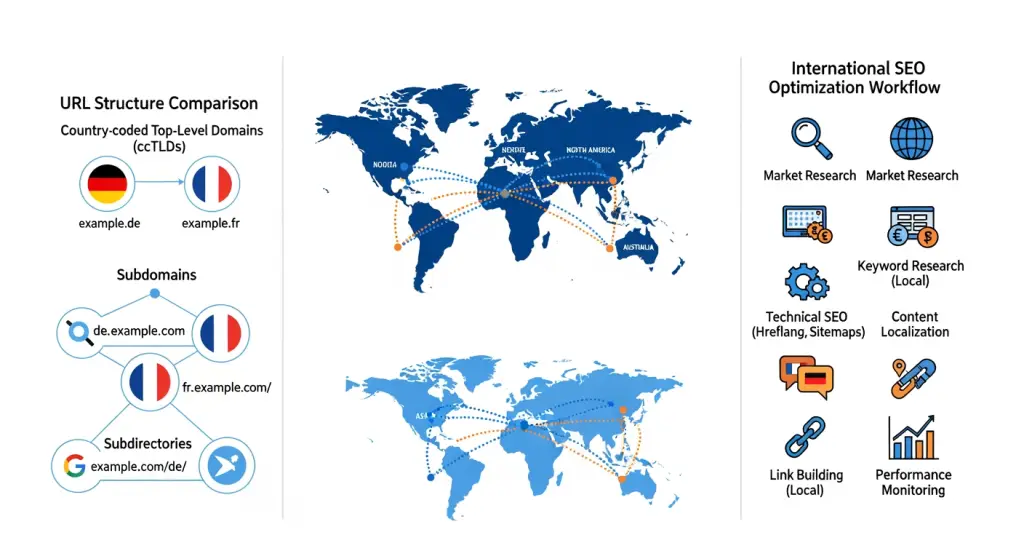 Escolha a estrutura de URL (subdiretórios recomendados para a maioria), implemente corretamente as tags hreflang, crie conteúdo genuinamente localizado que reflita a intenção de pesquisa regional, crie backlinks de sites locais em países-alvo e garanta velocidades de carregamento rápidas por meio da implementação de CDN.