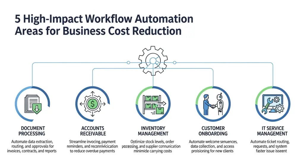Com base em minha experiência na criação de fluxos de trabalho em todos os setores, essas cinco áreas fornecem consistentemente o ROI mais rápido para PMEs que buscam redução de custos de IA por meio de exemplos de automação de fluxo de trabalho:
