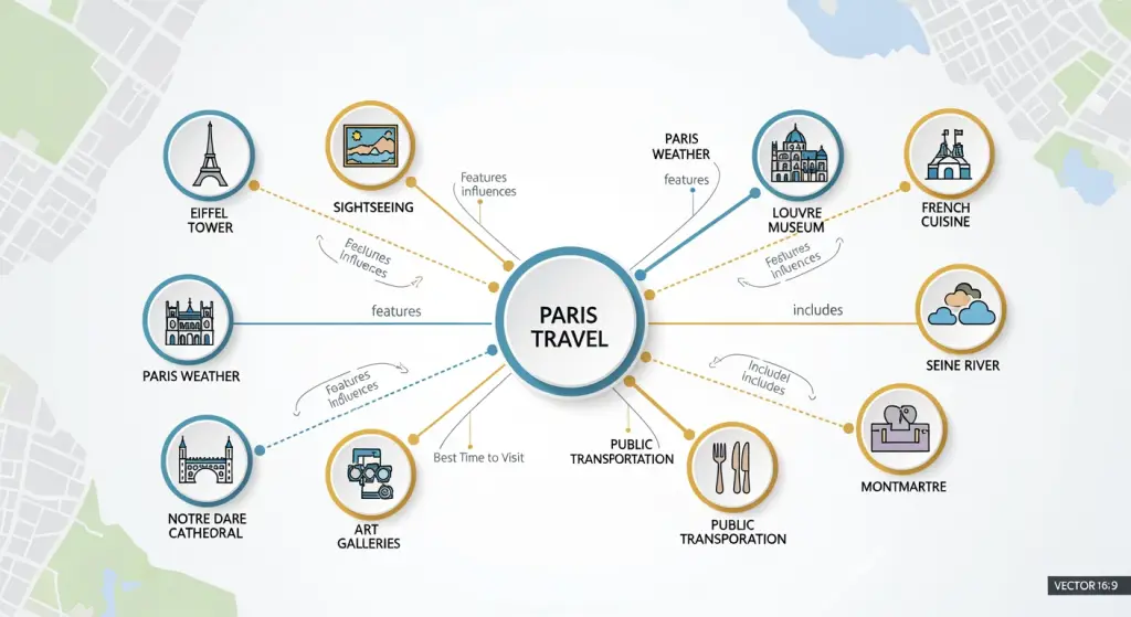 Nova abordagem? Identificamos entidades: Torre Eiffel, Louvre, culinária francesa, arrondissements, clima sazonal, custos de voos. Em seguida, conectamos essas entidades com marcação de esquema e conteúdo contextual.