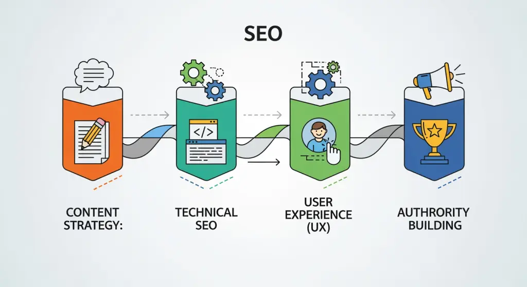 A estratégia de SEO exige o equilíbrio de quatro componentes essenciais: conteúdo, aspectos técnicos, experiência do usuário e criação de links, que devem funcionar juntos como um sistema integrado, de acordo com o Guia de estratégia de SEO 2025 da ThatWare. Veja como cada peça se encaixa ao considerar o significado completo da estratégia de SEO: Leia mais: AI Voice Cloning Free: Revolucione a criação de conteúdo.