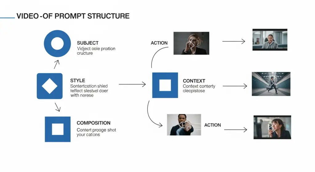 Diagrama mostrando componentes estruturados do prompt com setas apontando para diferentes elementos do processo de geração de vídeo