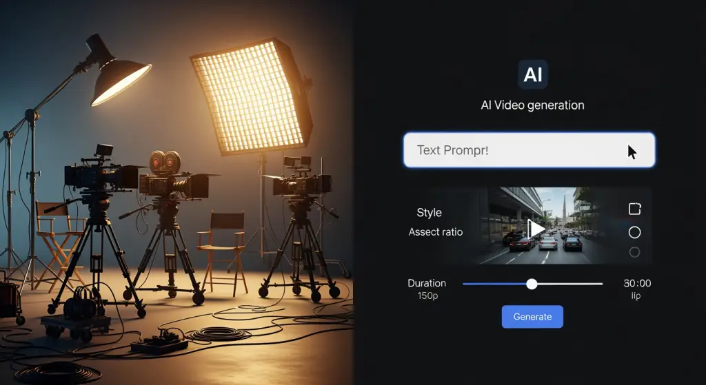 Comparação de tela dividida mostrando a configuração de produção de vídeo tradicional versus a interface de vídeo gerada por IA com texto de aviso e saída gerada